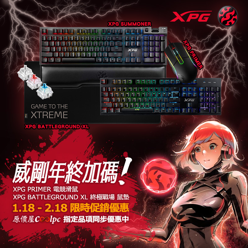 已經在我們原價屋開跑的4把威剛XPG電競鍵盤促銷活動,現在又要再加碼兩款即戰力裝備啦~而且這次還不是鍵盤設備喔,而是採用耐久PBT防滑材質、符合人體工學設計,還具備3款RGB燈效、12000 DPI以及2000萬次點擊歐姆龍微動的「XPG PRIMER RGB 電競滑鼠」!還有一張900x420x3mm大尺寸、防刮耐磨並具備防潑水特性的「XPG BATTLEGROUND XL 終極戰場 鼠墊」!兩樣XPG產品都是一時之選,收了絕對有助於你增強現在的電競戰力,快點趁這次有優惠價格的時候把他們帶回家吧~促銷時間為1/18~1/20,同期4把鍵盤也是同步促銷中,有興趣的朋友真的要好好把握,因為活動配額數量賣完或時間截止就沒有囉!