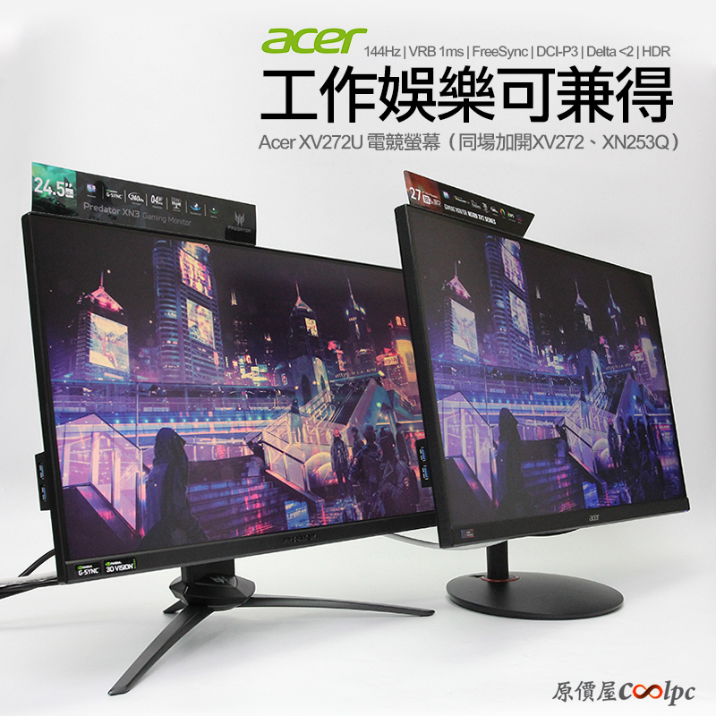 @2019/09/17 ,12:01身為一名遊戲玩家想獲得更好的遊戲品質除了電腦規格足夠使遊戲流暢運作外,螢幕的表現也是至關重要畢竟遊戲再怎麼流暢要是螢幕表現不出來也是白費功夫,為此就有越來越多玩家在遊戲螢幕的選購上願意花更多預算挑選高規格的電競螢幕,而這次要帶來的就是Acer 推出的27吋及24.5吋電競螢幕,體積都不算太大對於桌面空間有限的玩家更友善,規格上NITRO XV272 P及XV272U P 則分別提供FHD 及QHD 解析度,採用IPS 面板並提供144Hz 畫面更新率、VRB 1ms 反應時間,支援AMD FreeSync,VESA DisplayHDR 400 認證,具備ZeroFrame 無邊框設計,並在較高頂級的XV272U P上支援DCI-P3 廣色域及Delta E <2 認證,不僅玩遊戲就連影像工作也能得心應手,最後一款Predator XN253Q X 部分提供FHD 解析度、240Hz 畫面更新率、0.4ms 反應速度,支援NVIDIA G-SYNC,具備ZeroFrame 無邊框設計並支援抗藍光及不閃屏護眼功能,那麼現在就來看看詳細的開箱介紹吧!
