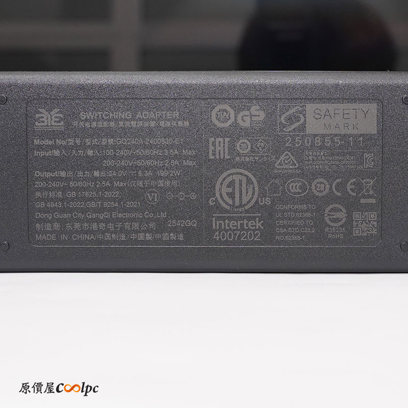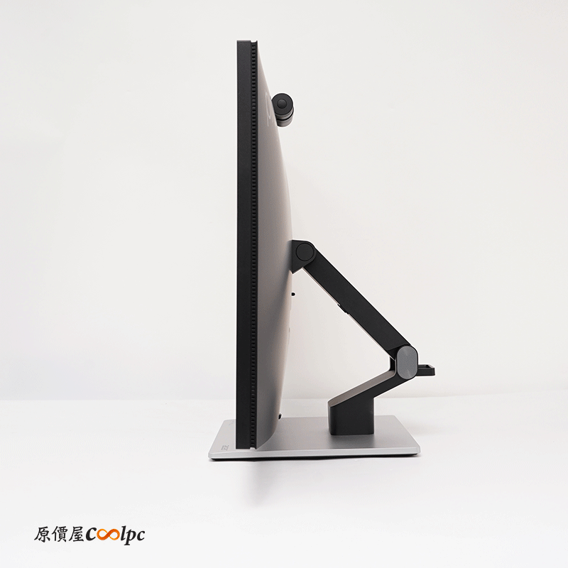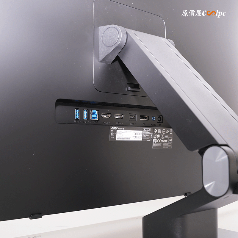 I/O 設計在正後方,有 2 x USB3.2 Gen1、USB-B訊號傳輸線(HUB、觸控功能專用)、HDMI 2.1、Type-C (90W)、DisplayPort 1.4、Audio、和 DC 供電介面。