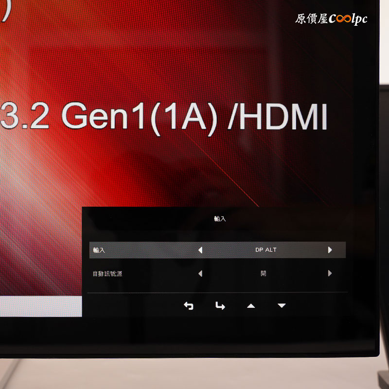 對應剛剛螢幕底下的快捷鍵,從左至右分別是輸入源切換、模式切換、亮度調整、功能選單。