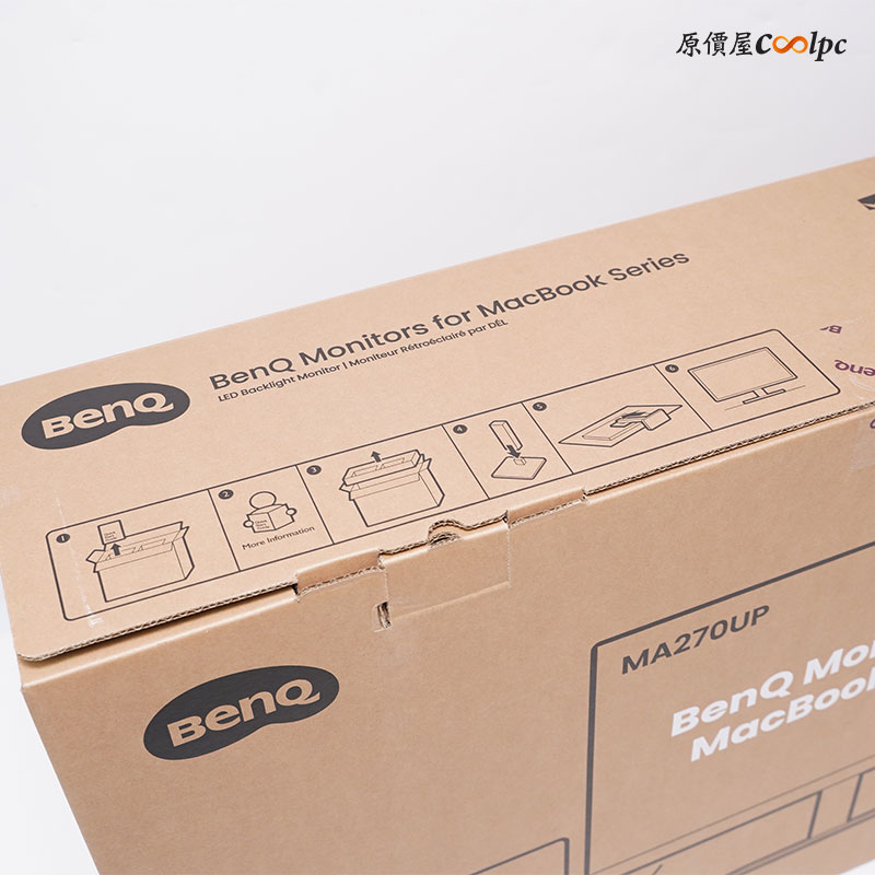 BenQ MA270UP 螢幕專為 apple Mac 生態而生!環保外盒沒有太多花俏的圖案,外盒背面則是螢幕與 apple Macbook 和 iPad、iPhone 示意圖,頂部有螢幕拆裝簡易教學,內部則是特色介紹,像是同步色彩,與 MacBook 控制同步亮度、音效設定,強大的 Hub,輕鬆串聯 USB-C 裝置,還有領先業界的護眼技術來保護眼睛。