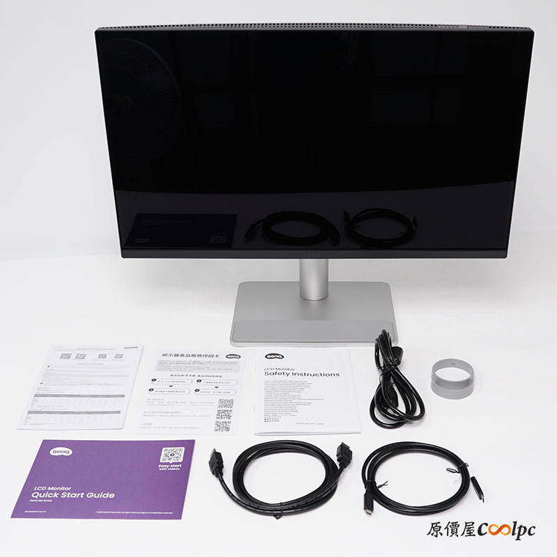 盒子內所有配件有鏡面螢幕本體、產品保固卡、快速指南手冊、電源線、整線夾、HDMI 2.0 線材、USB-C 線材。