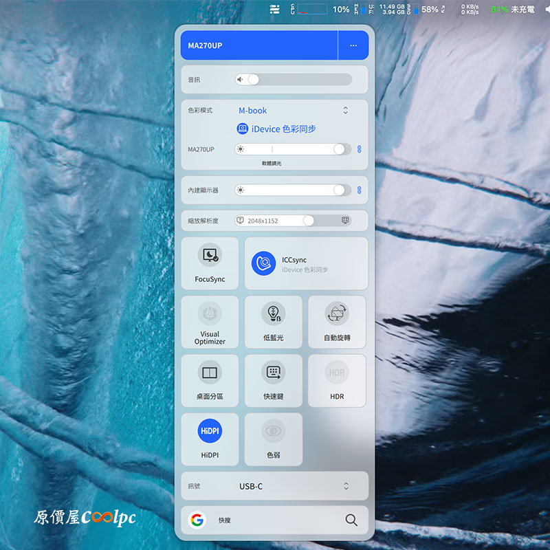 M-book iDevice 色彩同步模式開啟,外接螢幕的色彩幾乎是跟 MacBook 一樣,如果是 Apple Mac 全家統的用戶,真心推薦 Benq MA270UP 鏡面螢幕,體驗上來說真的不錯,只要不是強光直射螢幕,抗反光的效果真的不錯,BenQ MA270UP 鏡面這台也有跟蘋果 Apple Studio Display 比較(點我查看),讓用戶用一半價格可以獲得幾乎一樣的視覺效果,小編個人覺得還蠻值得投資。