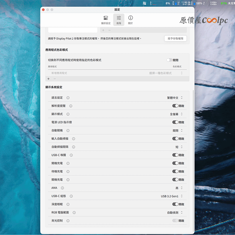 進階選單預設幾乎都是打開,只有自動關機與背光控制是關閉,另外可以把 USB-C 組態調整成 USB 3.2 Gen1。