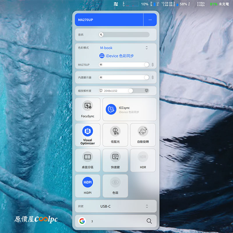 DisplayPolot 2 軟體安裝好,控制介面跟手機快捷非常像,沒有弄得很複雜,簡單明瞭。想要跟螢幕同步顏色,務必打開 M-book 模式,有一個 iDevice 色彩同步,會自動抓取電腦的版本,若錯誤可以再進去挑選自己的Macbook 型號;同步之後你要停整音量跟螢幕亮度都可以透過鍵盤或軟體來操作。