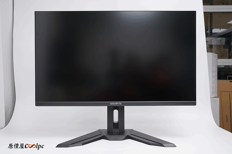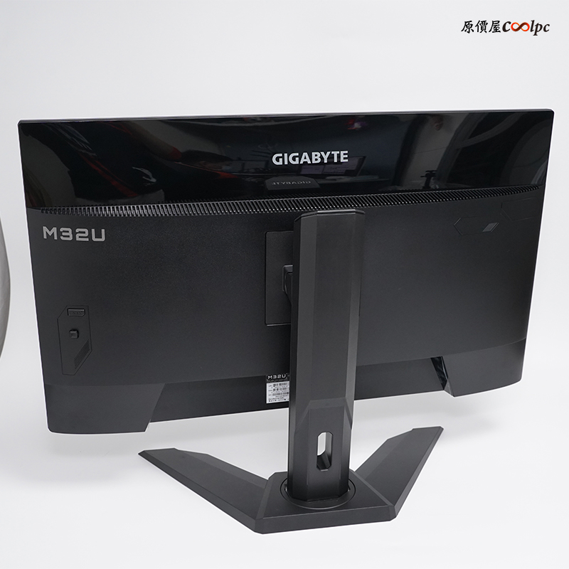 螢幕背面的部分採用流線型,上方為鏡面,中間使用啞光磨砂材質,下方左右兩個則是網狀材質。鏡面原本會有保護套,安裝好之後就可以將它撕下來,螢幕切換開關則是設計在右後方,後方I/O有2個HDMI 2.1(支援 PS5 and Xbox Series X at 4K UHD@120Hz 4:2:0)、1個DisplayPort 1.4 (DSC)、Type-C(需支援DisplayPort Alternate模式)、USB3.2 Gen1連結電腦線材連結埠、3個USB3.2 Gen1輸入連結埠以及一個3.5mm耳機連結埠。另一邊則是電源連結埠,電源旁邊還有一個開關可以使用,螢幕支撐架上方還有GIGABYTE LOGO,底座下方則是KVM切換功能。