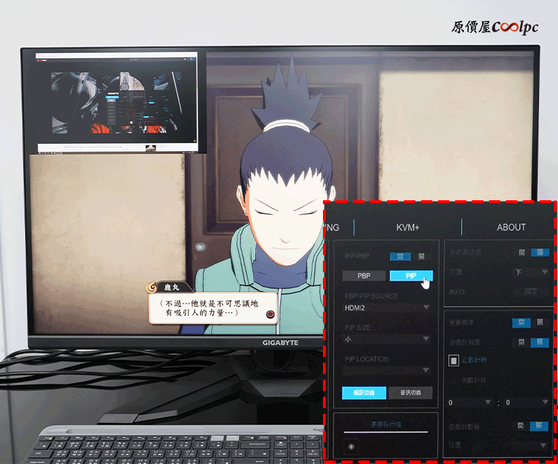 除了支援KVM功能之外,也有提供PIP、PBP模式可以使用,這對住在外面的朋友來說超級無敵方便!可以同步顯示兩個畫面,一邊打PS5一邊查攻略,甚至是兩台電腦共同使用一台螢幕打LOL也行!