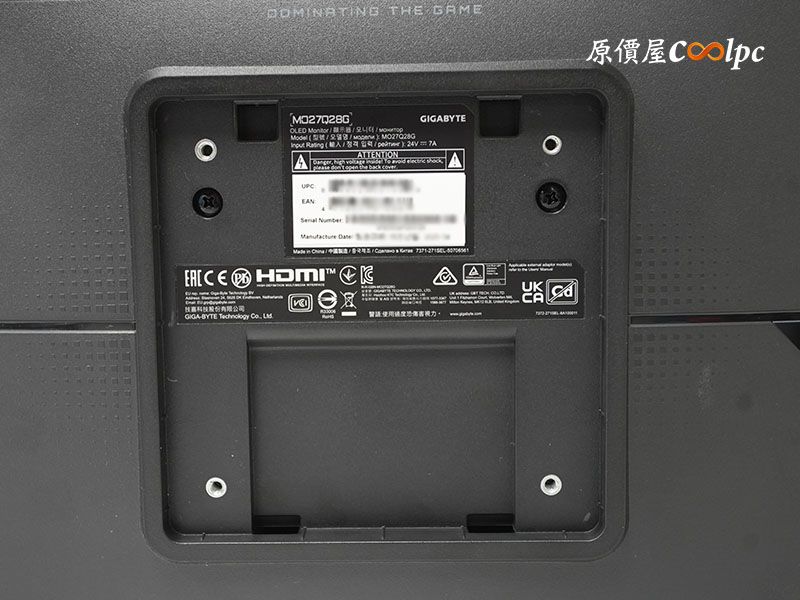螢幕背後留有 VESA 100×100mm 螺絲孔,想掛牆、螢幕支撐架懸空都沒問題,中間還貼著序號與出廠日期的小貼紙。