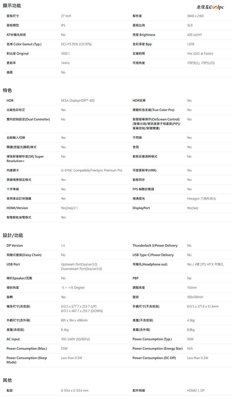 活動內容:LG 27GR93U-B(2H1P/1ms/IPS/144Hz/無喇叭/FreeSync Premium)HDMI 2.1 $17900↘$15900 現省$2000