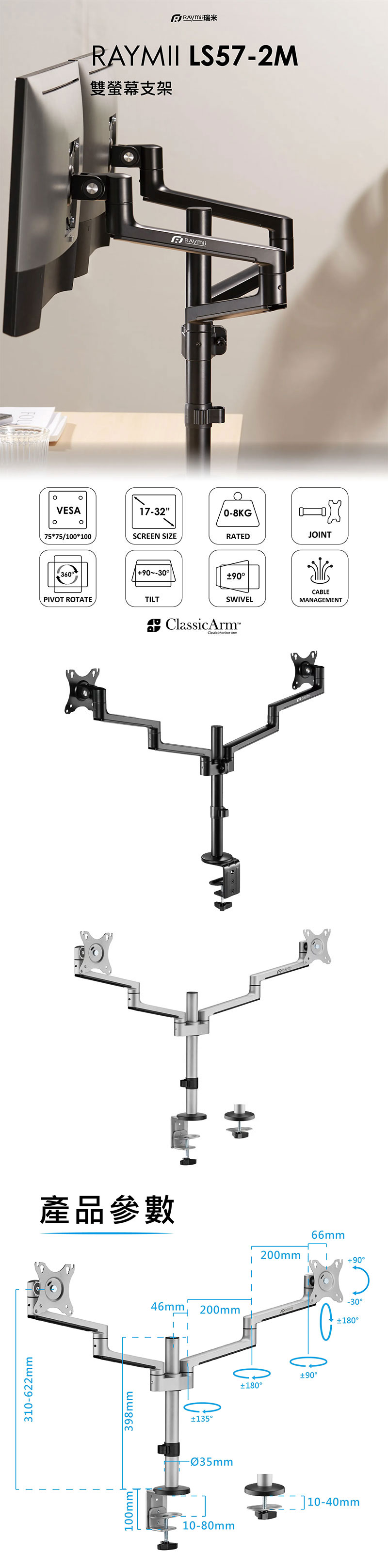 Raymii LS57-2M (雙螢幕/穿夾兩用/鋁合金懸臂/關節式/17-32吋/承載8KG/黑色) $2399 送酷幣800