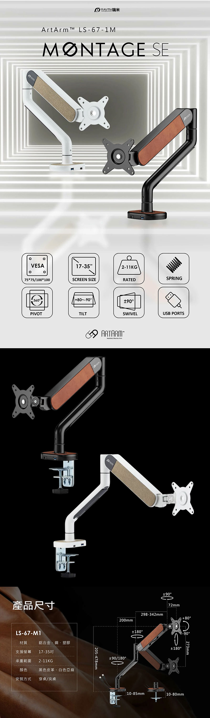 Raymii LS-67-M1 (單螢幕/穿夾兩用/機械彈簧/承載11KG/17-35吋/USB3.0*1/TYPE-C/黑色) $2,299 送酷幣1,000