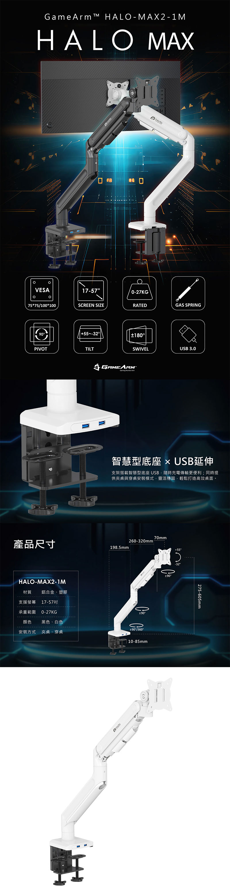 這麼多款要怎麼挑呢?入門首選推薦 LS57-1M 鋁合金懸臂單螢幕款,高質感的銀黑雙色設計,重量承載 8 KG,最大尺寸可安裝 32 吋;若您是多工效率派,可選 LS57-2M 雙螢幕款視野加倍,效率翻倍;若您追求靈活的操控感與擴充性,L-U9-1M 與 LS-67 M1 機械彈簧系列 絕對是你的得力助手,兩者皆貼心配置 USB3.0 與 TYPE-C 接口,傳輸充電隨手可得,L-U9-1M 承重 10KG、LS-67-M1(黑/白)承重 11KG,外觀設計也比較好看,適合在辦公室使用;對於擁有 32 吋以上螢幕或曲面的玩家,HALO-MAX 氣壓式系列絕對是首選,無論是承重 20KG 的 HALO-MAX-1M 或是承重 27KG 的 HALO-MAX2-1M,都能輕鬆駕馭 49 至 57 吋的螢幕,內建雙 USB3.0 擴充,傳輸充電更便利,讓桌面更簡潔,歡迎有興趣的朋友可以利用網路下單,或到門市做詢問囉。