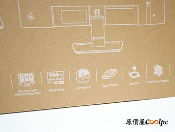 (點小圖放大)包裝採用環保紙盒設計,下方標示有 178° 廣視角、144Hz、極窄邊框、Type-C Display、護眼技術與支援 VESA 掛架等重點功能,從文書到電競通通一應俱全!側邊貼紙則簡單列出產品規格、製造日期與序號等資訊。