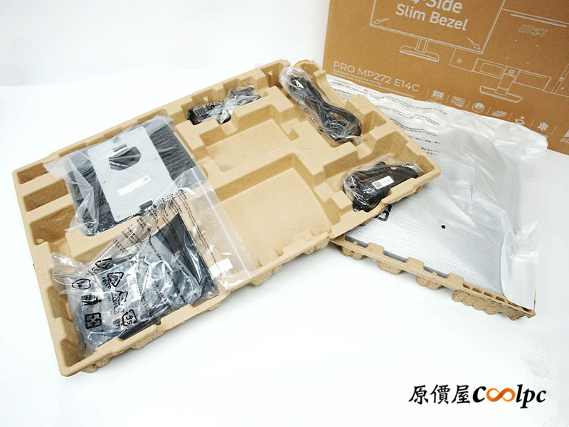 內部以兩層紙質包材防止運送時的碰撞,腳架與配件放在上層,螢幕本體則位於下層。