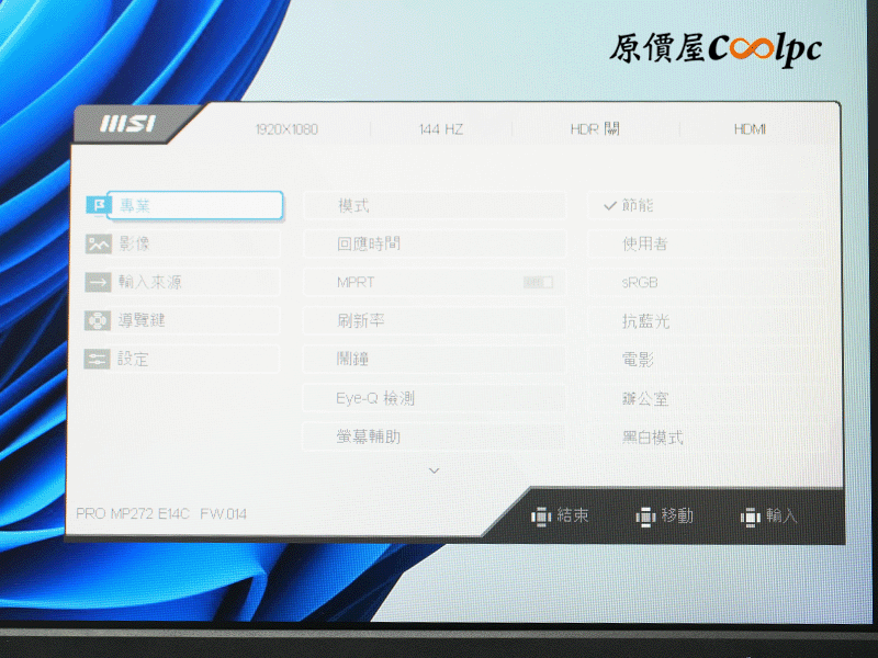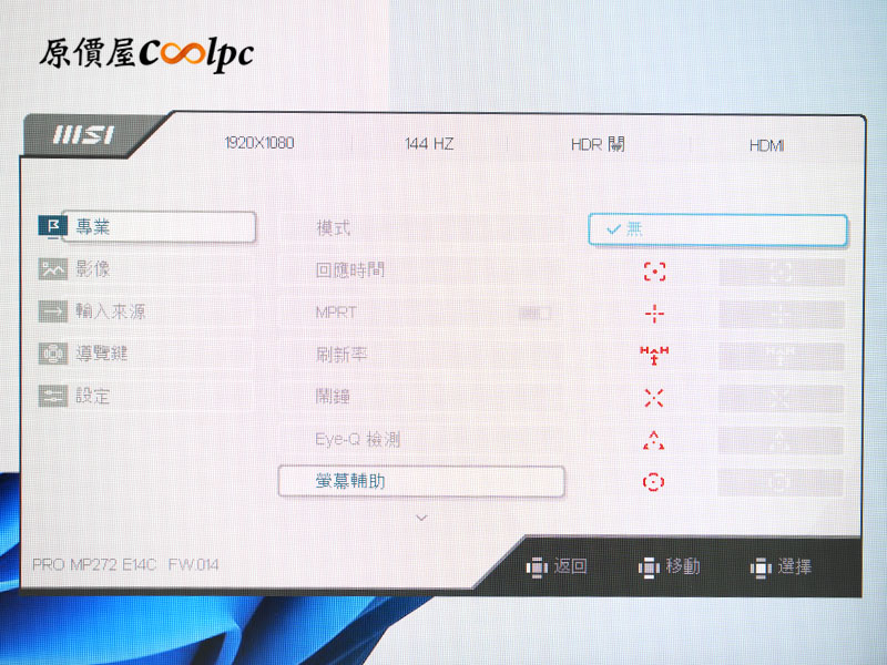 選單分頁包含「專業模式」、「影像」、「輸入來源」、「導覽鍵」與「設定」五大類,細部功能像是顯色模式、更新率、亮度、對比、色溫、低藍光護眼等通通有,從文書到遊戲都能依需求微調。至於 FPS 玩家最愛的物理外掛「自訂準星」也收在螢幕輔助細項裡,該有的全都有,真的沒什麼好挑的!