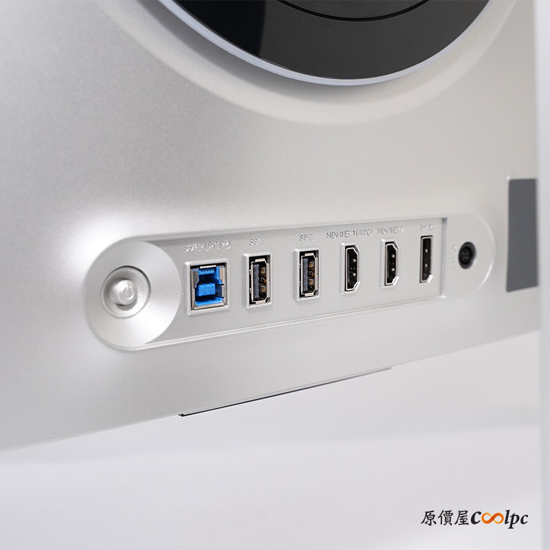 I/O的部分設計在正後方,從左邊到右邊分別是控制/開關按鈕、USB3.2 Gen1 HUB連接埠、USB3.2 Gen1 x2 插槽、HDMI 2.1 x2插槽、DisplayPort 1.4插槽、圓頭供電插槽。他的HDMI 1可是有具備ARC的功能,這通常只有在電視才會有的功能,直接下放到電腦螢幕上,可以讓你接家庭劇院或聲霸來提升聆聽品質 。