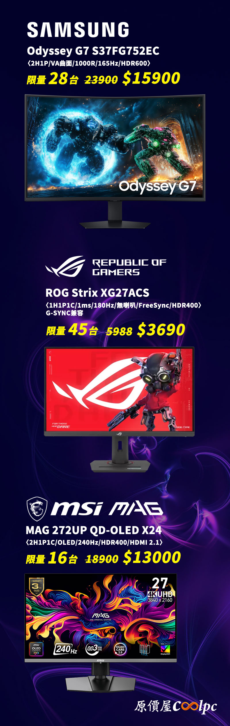 今年年初的玩家盛會 Taipei Game Show 2026 已熱血落幕,但對真正懂行情的玩家來說,展場結束才是撿寶的開始!在展場舞台上陪伴玩家試玩、展示畫面實力的那些螢幕,如今終於有機會用很優惠的價格讓玩家們輕鬆帶回家~沒有錯,今天這檔就跟先前熱賣的《TGS 華碩神域覺醒機》一樣,都是真正在 TGS 展場裡的螢幕,也就是賣完就沒有的限量釋出。而且陣容還不只是普通的款式,而是三大玩家熟悉的品牌「Samsung」、「ASUS」、「MSI」。從沉浸曲面、電競高刷到 OLED 旗艦畫質,一次把不同玩家族群的需求全補齊。重點是價格也跟著展場一起「謝幕價」大跳水呢!或許很多玩家一聽到「展場機、體驗機」可能會猶豫,但其實剛好相反。因為能在 Taipei Game Show 這種大型展覽長時間展示運作的設備,往往都經過實際運行與穩定測試,狀態反而更可靠。再加上展後釋出通常會直接用福利價出清,CP 值幾乎都是破表啊~這次活動三款螢幕數量各是「Samsung Odyssey G7 S37FG752EC」28 台、「ASUS ROG Strix XG27ACS」45 台、「MSI MAG 272UP QD-OLED X24」16 台,看起來不少,但在玩家社群裡其實很快就會被掃光。所以你原本就打算升級螢幕,那這一波幾乎等於直接跳級升級了。延遲看到畫面是螢幕的問題,延遲下單… 那就是你的問題啦~想要的朋友… 趕緊來參加搶購吧!