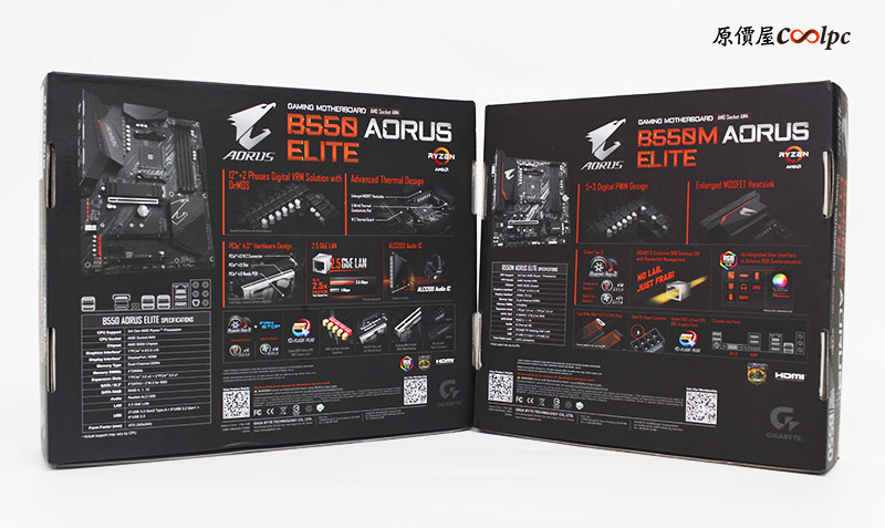 兩張主板的包裝風格一致,都是採用AORUS經典鷹頭做為主封面,左下角為主機板的產品型號,右下也有B550晶片組的標示,而封底則是兩張主板的性能技術以及多樣特色,像是供電設計的相數、PCIe 4.0、支援自家RGB FUSION 2.0技術以及高階的音效處理用料等!