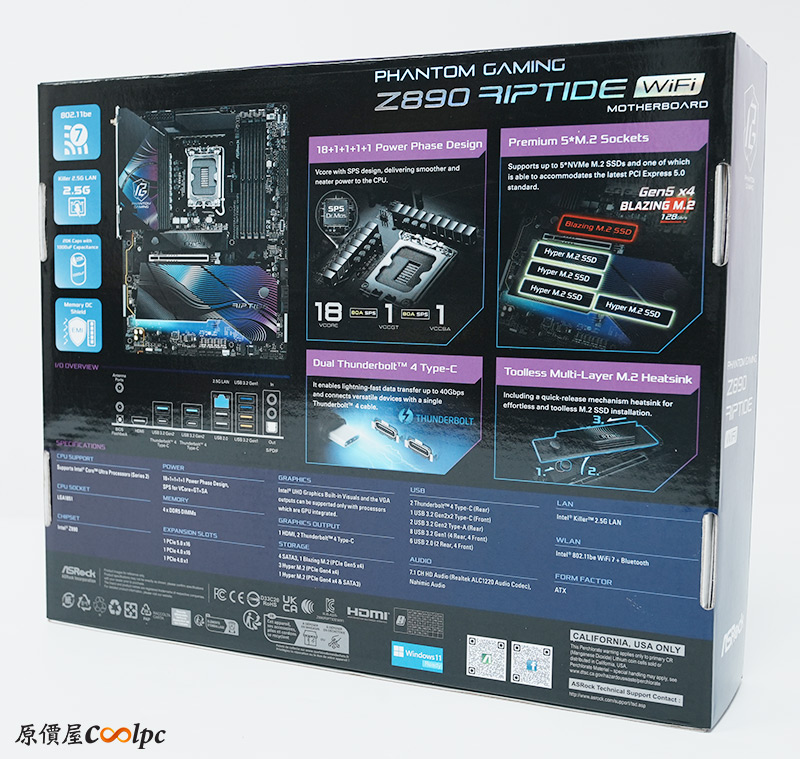 背面有更詳細的特色介紹,先是簡易的主板規格列表還有I/O簡易圖示,下方則是圖樣標示18+1+1+1相供電,搭載20K長效電容。BLAZING M.2(PCIe Gen5)硬碟有雙層導熱墊片,還有雙Thunderbolt 4連接埠, USB3.2 Gen2x2前置Type-C擴充,Memory OC Shield,Realtek ALC1220音效解碼器,Intel WiFi 7網卡等。