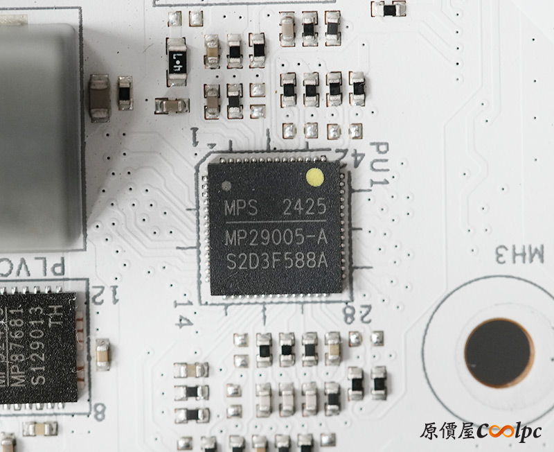 (點小圖放大)卸下散熱裝甲可以看到內側有導熱膠墊(連無線網卡都有),Z890 Riptide WiFi使用伺服器級低損耗PCB板,加入2oz銅製PCB穩定信號,20K長效電容,18+1+1+1相供電。搭載一顆Z890晶片,MP29005-A PWM主控晶片,NUVOTON NCT6686D環控晶片,ALC1220音效晶片,WiFi 7網卡 Intel BE200NGW(320MHz, 4096QAM, 5.8Gbps),其餘晶片可以參考小圖。