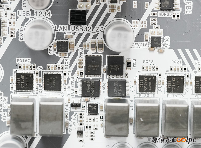(點小圖放大)散熱裝甲內都有導熱膠墊輔助散熱,Z890 PRO RS WiFi White使用1000uF耐久電容,提供16+1+1+1相供電,並用上2oz銅製PCB製作。主板配備一顆Z890晶片,RT3638AJ PWM主控晶片,NUVOTON NCT6686D環控晶片,Realtek ALC897音效晶片,WiFi 6E網卡Intel AX211NGW,其他晶片同樣放在小圖中供有興趣的玩家參考囉。