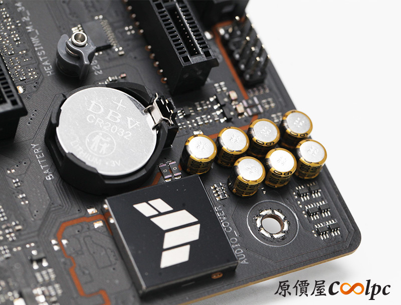 顯卡主要有一組PCIe 5.0 x16(紅框),插槽有金屬強化設計。往下是一組PCIe 4.0 x16(supprots x4 mode, 藍框),一組PCIe 4.0 x4(綠框)。這裡最可惜就是沒有PCIe SLOT Q-RELEASE按鈕,不行啊!我好像聽見TUF說它也想要這個酷東西!