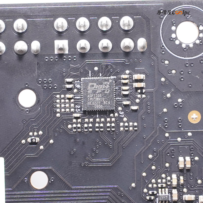 接著就是內部的用料啦!拆掉厚實一體式散熱片之後內部採用18+2相供電,每相最大承受電流110A,PWM晶片為ASP2205,MOSFET為SIC8504A和ISL99390,以及數顆10k 黑色金屬電容,Intel Thumderbolt 4 JHL8540晶片、3顆USB 3.2 Gen2 10Gbps GL9950NE和PI3EQX1004中繼晶片以及ASM1543 Type-C介面、2.5Gbe Intel SLNMH晶片、音效晶片為Realtek ALC4082和ESS SABRE9218PQ DAC/AMP以及數顆音效電容組成,而這次PCH晶片採用兩顆設計,分散處理USB、SATA、M.2通道介面,背面還有4顆 Phison PS7101 PCIe 5.0晶片,WIFI 6E無線網路+藍芽5.3 晶片為Intel AX210。