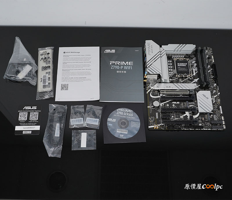 PRIME Z790-P WIFI CSM主機板散熱裝甲雖然沒有PRIME Z790-A WIFI CSM那樣浮誇,不過該有的細節還是不馬虎!像是MOSFET厚實散熱片、M.2散熱裝甲,4個記憶體擴充插槽、PCIe 5.0 x16介面等,PCB板也有宇宙恆星圍繞在CPU周圍,內部配件有WIFI模組、I/O檔板、使用手冊、2 x SATA 6Gb/s排線、M.2橡膠軟墊包、Q-Connector、2 x M.2螺絲包、ASUS Control Center Express兌換序號。