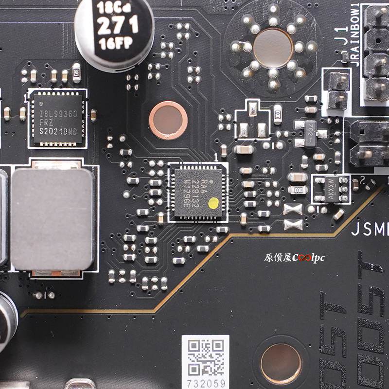 用料的部分,採用12+1+1 相數位供電、PWM 控制晶片RAA 229132、MOSFET晶片ISL 99360,每相最大承受電流60A、顯示控制晶片IT66318FN和NB7N和3532GABB127、Type-C 晶片為ITE 8851FN和GL9905、USB3.2 Gen2晶片為GL3590和GL9901NE、2.5Gb網路晶片為Realtek 8125BG、音效晶片 Realtek ALC1200和數顆音效電容、Wi-Fi 6E無線網路晶片Intel AX201。
