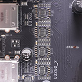 技嘉B550 AORUS MASTER 採用16相數位供電技術,主控晶片為英飛凌XPDE132G5C、MOSFET晶片為IR TDA21472、USB 2.0晶片GL850S、USB3.2晶片NB7N1102GAMA、Realtek 8125 2.5GbE網路晶片和兩顆X195038處理器電源控制晶片、Realtek ALC1220音效晶片和數顆日系電容、4顆PI3DBS 16412ZHE PCIe 4.0、P13EQX16 000ZHE切換晶片和Intel AX200NGW WI-FI無線+藍芽模組,整體的用料不輸給X570系列主機板,主要的PCIe和 M.2插槽都有支援PCIe 4.0傳輸,和X570最大的差異在於後方I/O介面配給速度不同。