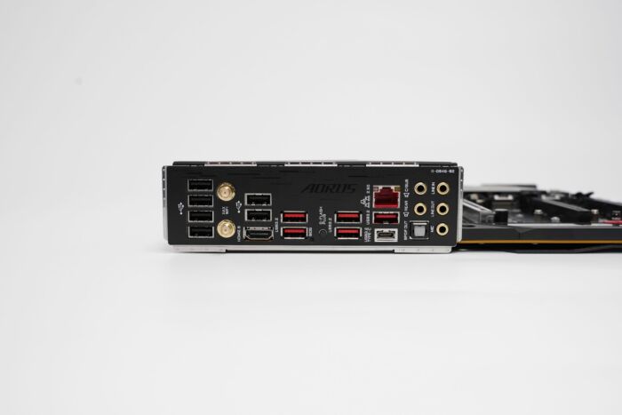 I/O提供6個USB 2.0插槽、Intel WI-FI 6 AX200 +藍芽模組、HDMI(2.1、HDCP 2.3、HDR)、5個USB 3.2 Gen2插槽(紅色)、1個USB3.2 Gen2 Type-C、Q-Flash Plus插槽、1個2.5GbE網路孔、S/PDIF輸出和鍍金AUDIO音效插槽。