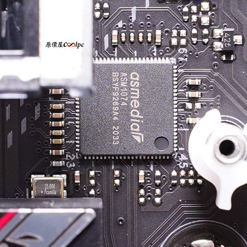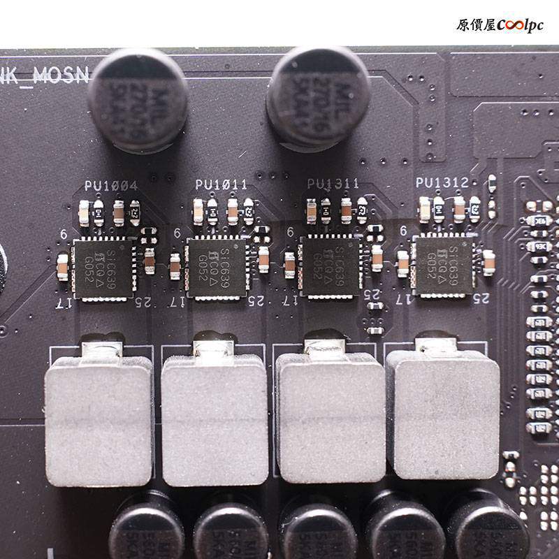採用8相數位供電技術,主控為ASP1900B、MOSFET晶片BGNO0422、顯示晶片切換器為PI3DPX 1203BZHE、TDP158、網路晶片為RTL8125BS、USB3.2晶片為GL9905、ITE IT8851FN、S210為USB C AUDIO偵測晶片、音效晶片 S1220A、配上SV3H712放大器,WI-FI藍芽為Intel Wi-Fi 6 AX201。