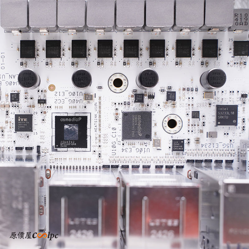 主機板底部也有一個前置 USB 3.0 和前置 USB3.2 Gen2x2 Type-C 介面;左上角則是 PCIe 通道切換器,預設是自動會辨別 PCIe 使用的協定和通道。