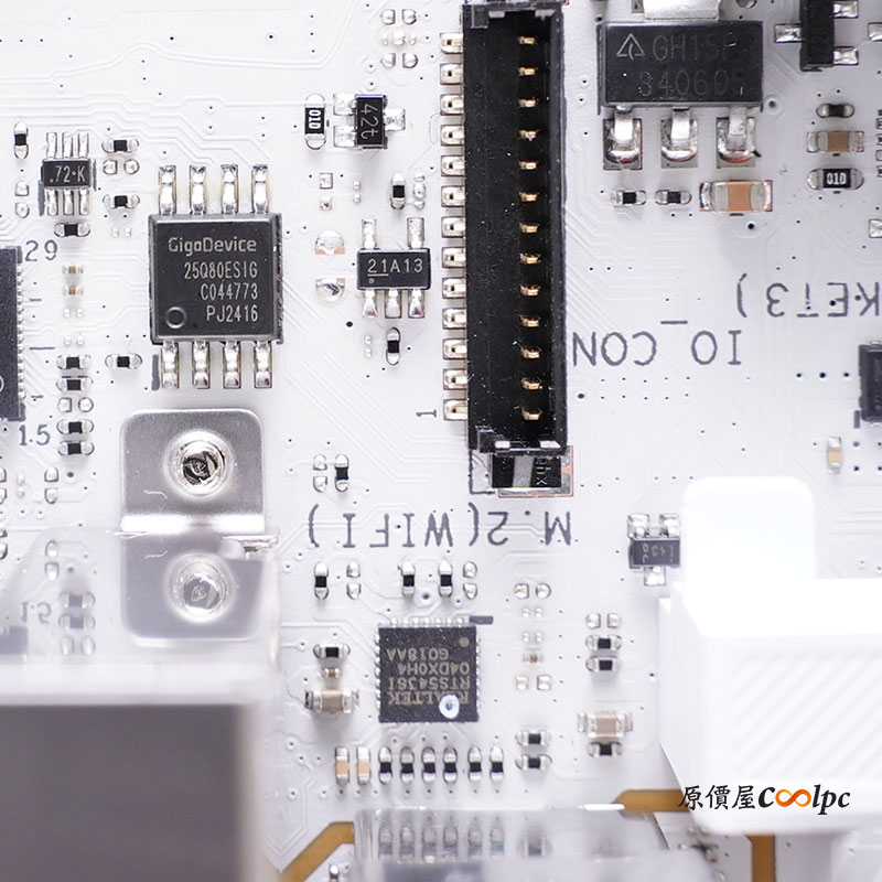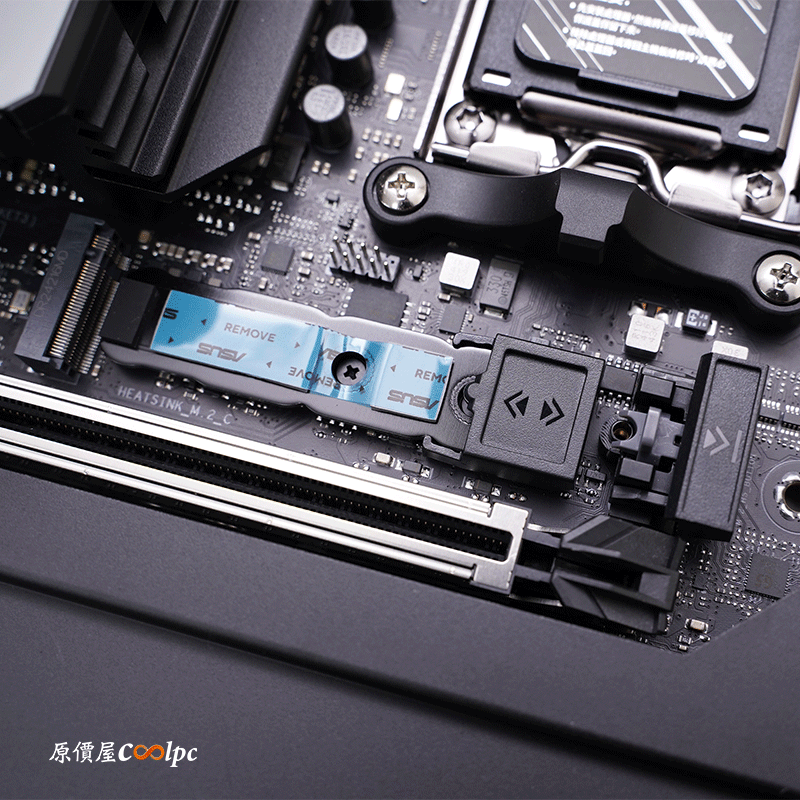 不得不說主機板 M.2 散熱裝甲都有加厚,應該是為了 PCIe 5.0 SSD 做準備!畢竟 Gen5 SSD 這麼熱,薄的散熱片根本壓制不住啊!箭頭上的散熱片有 M.2 Q-Release 快拆設計。