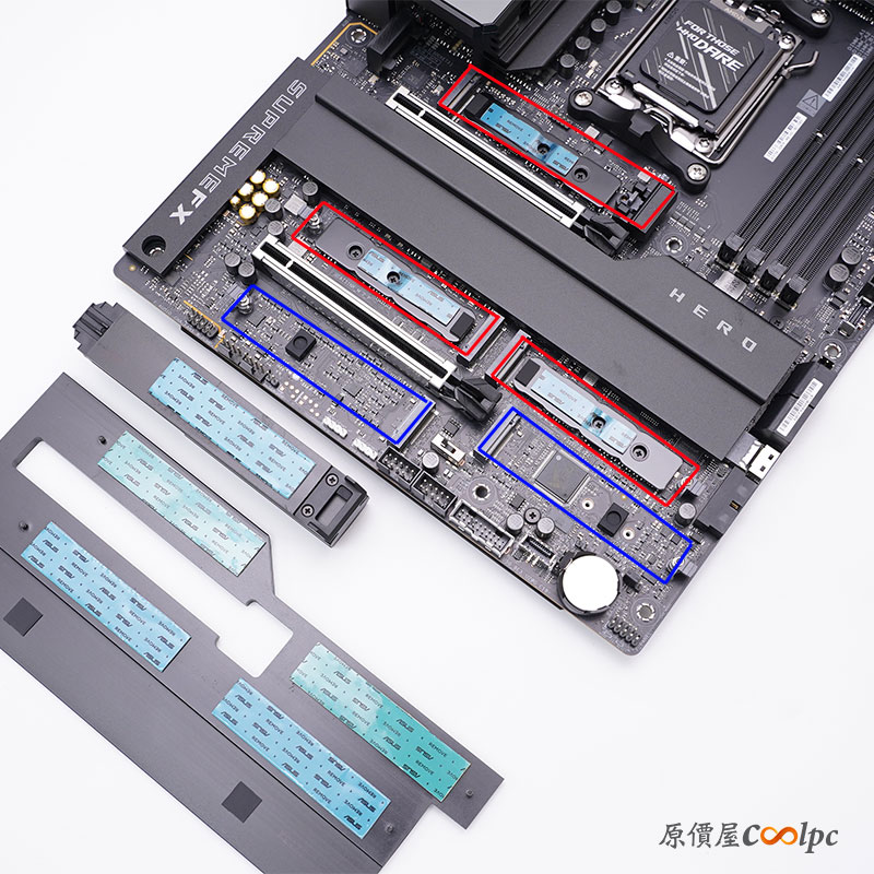 提供四個 M.2 插槽,紅色為 PCIe 5.0 x4,藍色為 PCIe 4.0 x4,最上方那組 M.2 具備 Q-Slide 快拆設計,全部皆有Q-Latch 免螺絲快速安裝設計;另外 M.2 插槽有和 PCIe 通道共用,手上比較多設備要安裝得先看一下底下分配列表。