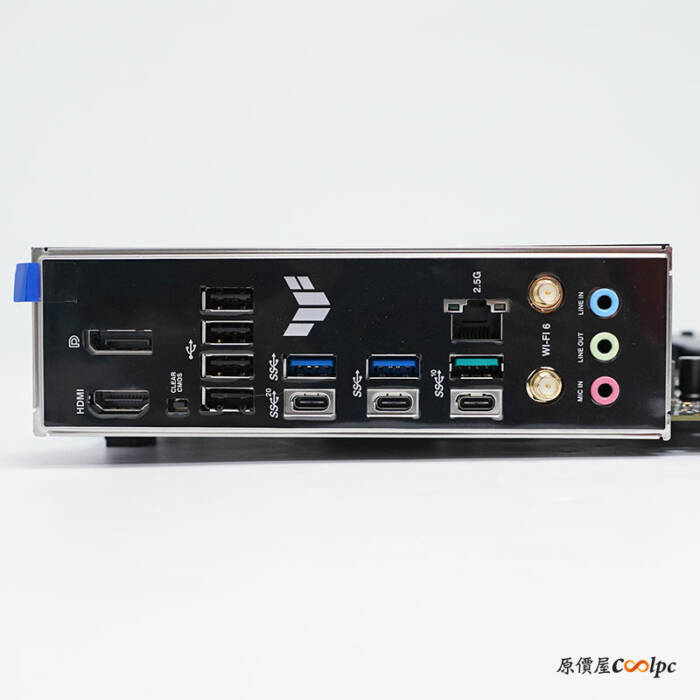後方I/O具備HDMI 2.1、DisplayPort 1.4、4個USB2.0、USB 3.2 Gen 2×2 Type-C、2個USB 3.2 Gen2(1 Type-A /1 Type-C)、3個USB 3.2 Gen 1 (2 Type-A /1 Type-C)、2.5GbE網路埠、WI-Fi 6無線網路+藍芽模組、3.5mm AUDIO音效插孔。