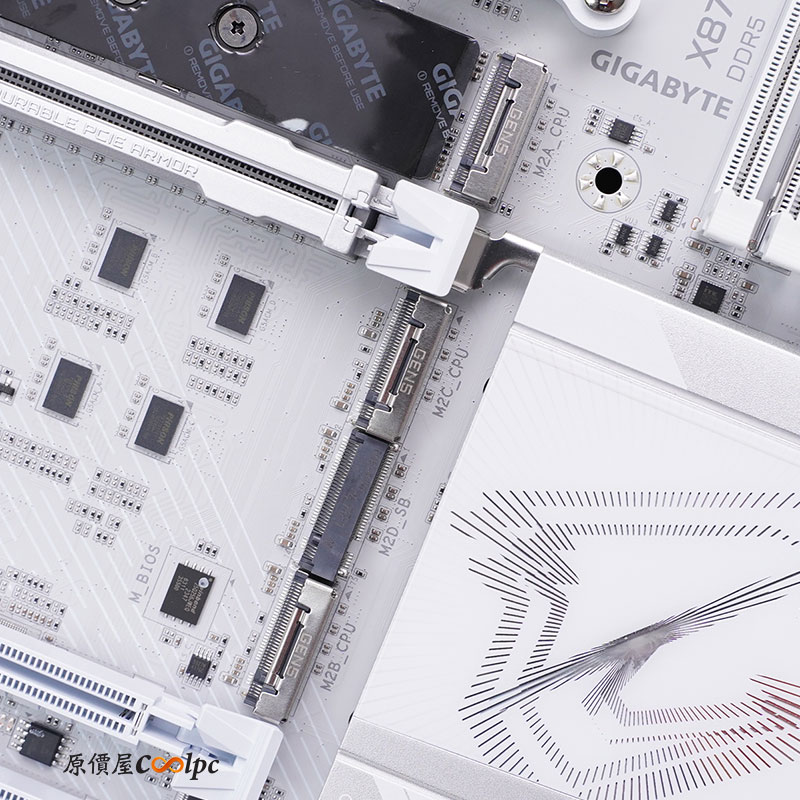 M.2 的散熱裝甲和主要 PCIe 插槽皆採用銀白配色,而且也應用了免螺絲和按鈕快拆設計,讓你在安裝或更換 SSD 和顯卡可以更快速省時!