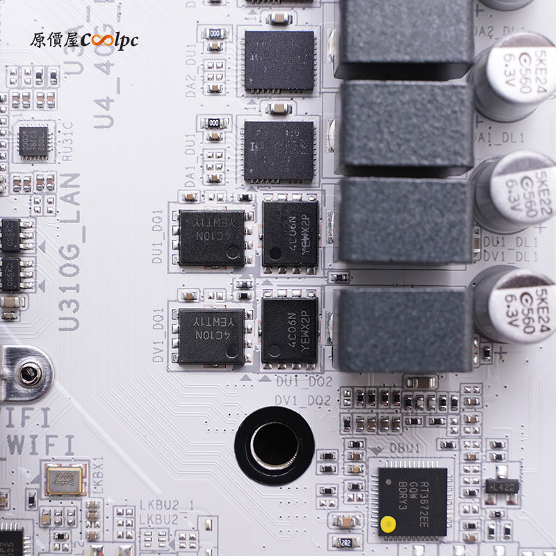 接著來看看內部用料吧!拆掉 VRAM 散熱裝甲除了零件是黑色之外,白色部分就占了主機板的 90% 了!供電採用 16(8+8並聯) Vcore (80A SPS) +2 SOC(80A SPS) +2 MISC,PWM 晶片為 Infineon XDPE192C3B,MOSFET 為 Infineon PMC41410,SOC 為 Onsemi NTMFS4C10N 和 Onsemi NTMFS4C06N 一上一下,MISC 則是 Richtek RT3672EE PWM 控制器,HDMI 控制晶片 Parade PS8209A,USB4 使用的晶片為 ASMedia ASM4242,具備顯示輸出功能,最多可輸出 2 組 4096 x 2304 @60Hz 影像輸出,2.5 GbE 網路片為Realtak RTL8125D,音效晶片 Realtek ALC1220 Audio Codec 和數顆音效電容,5 x PCIe 5.0 Redriver IC 為 PS7105-51,南僑為雙晶片,WI-Fi 7 + 藍芽 5.3 傳輸晶片為高通 QCNCM865,支援 11be 320MHz。