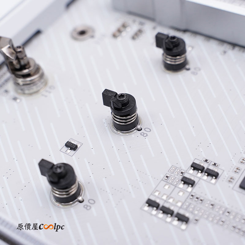 主機板的右上角除了除錯螢幕之外,還有內建開機和重開機按鈕在頂部。