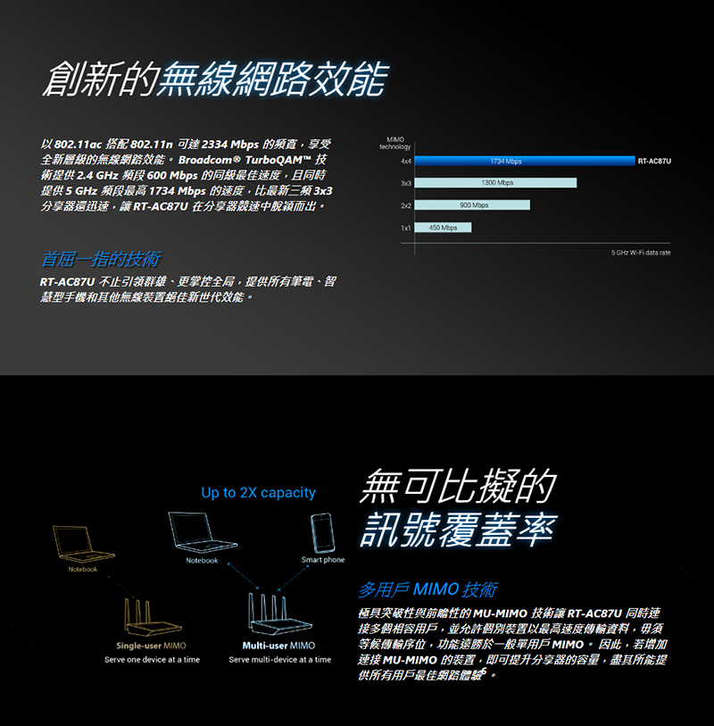 雖說802.11ax技術早已推出,連最新的AMD X570高階主板都搭載了ax系列網卡,但以台灣目前的家用型網際網路速度來說,ax標準可能還沒辦法完全發揮,802.11n/ac的用戶仍佔多數且較主流,今天原價屋要帶來的是ASUS RT-AC87U(AC2400)無線路由器,當初面世時可是號稱全球最快呢!支援2.4GHz(600Mbps)、5GHz(1734Mbps),4×4 MU-MIMO搭配AiRadar波束成形技術,多個裝置同時連線也能有效率的處理