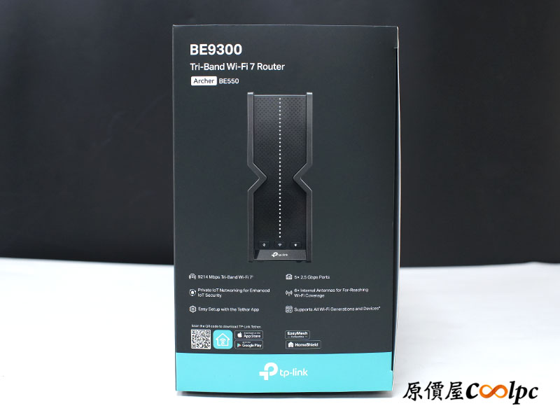 (點小圖放大)TP Link Archer BE550 無線路由器的包裝採用黑底 + 青色色塊搭配設計,醒目的黃金色 Wi-Fi 7 更是他想強調的重點!BE9300 為速度標示,分別是 6 GHz:5760 Mbps(802.11be)、5 GHz:2880 Mbps(802.11be)、2.4 GHz:574 Mbps(802.11ax),另外是超低延遲以及 360 度全方位 Wi-Fi 訊號覆蓋,還有 5 x 2.5Gbps(1WAN+4LAN),側邊則有其他功能特色提要,可支援 iOS、Android app 快速設定。