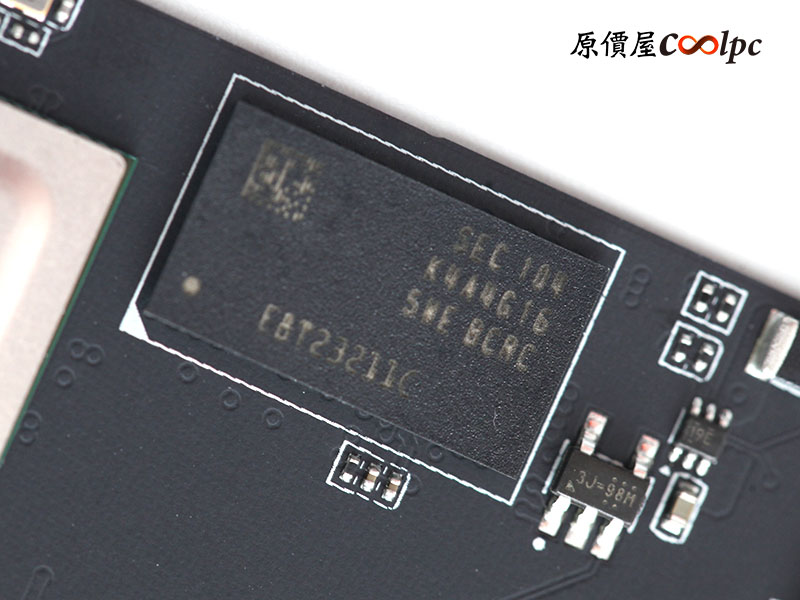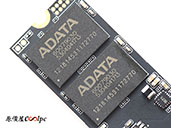 移除背面標籤序號貼紙後,可看見使用 Silicon Motion SM2267G 主控晶片、正反兩面共使用 4 顆 ADATA 3D NAND 自家封裝顆粒,總計容量 512GB,1 顆 Samsung 三星 K4A4G165WE-BCRC(DDR4/2400MHz/4Gb 256M x16)DRAM,依然是雙面顆粒設計,輕薄筆電要擴充得注意一下尺寸唷。