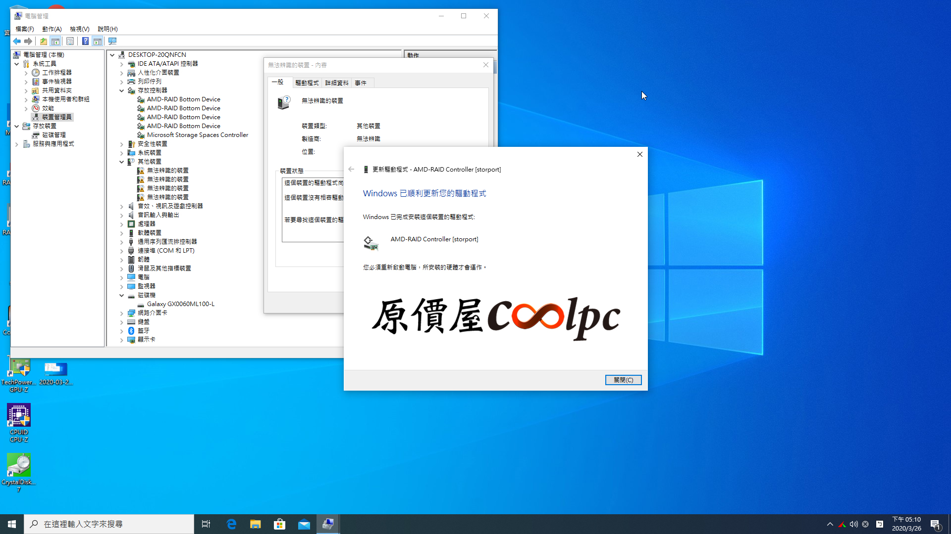 (點圖放大)重新開機後,裝置管理員會多出4個無法辨識的裝置,將裝置更新驅動成AMD RAID Controller(NVMe RAID驅動中的rcraid資料夾),4個都更新好就重開機。