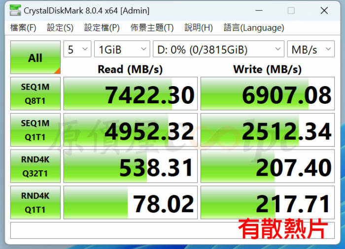 CrystalDiskMark 8.0.4和ATTO Disk Benchmark 4.01.0f1 讀寫速度測試軟體,隨機讀寫速度有達到 7,400MBs / 6,800 MBs 水準!4K讀寫速度78.9MBs/218.60 MB/s。