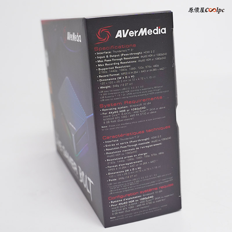 背面則是多國語言產品特色介紹,像是剛剛提到的4Kp60 HDR影像擷取、Full HD 240FPS 高幀率影像擷取、7.1/5.1生到環繞音效 Pass -Through、Thunderbolt 3傳輸介面、RGB多彩炫光。