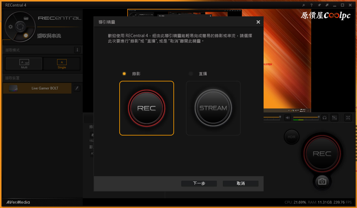 安裝完驅動和RECentral 4軟體就能開始直播或錄影啦!第一次開啟會引導精靈會詢問你要錄影還是直播。