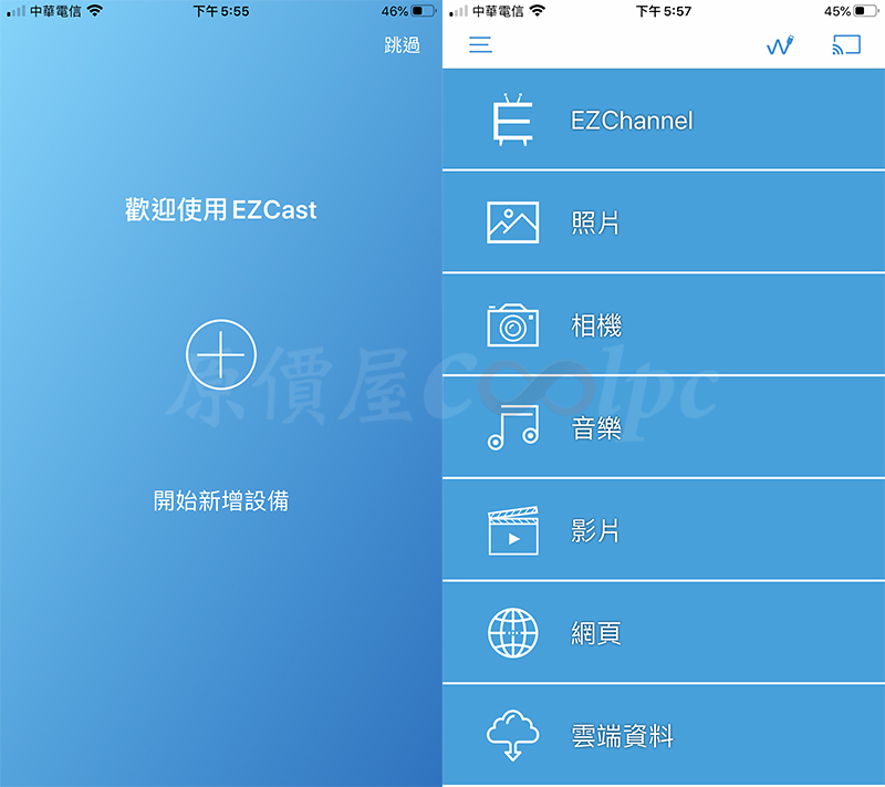 不僅PC/NB Windows環境下,Mobile裝置也可以,本次測試的手機使用IPhone(iOS)環境,到APP中心可以下載到EZCast軟體,只要確保Lantic ME01裝置和你的手機是在同一個區網內,就能偵測到設備,直接新增設備即可,過程非常簡單就不多贅述,app功能包含音樂/影片/照片、即時相機畫面等多媒體串流。