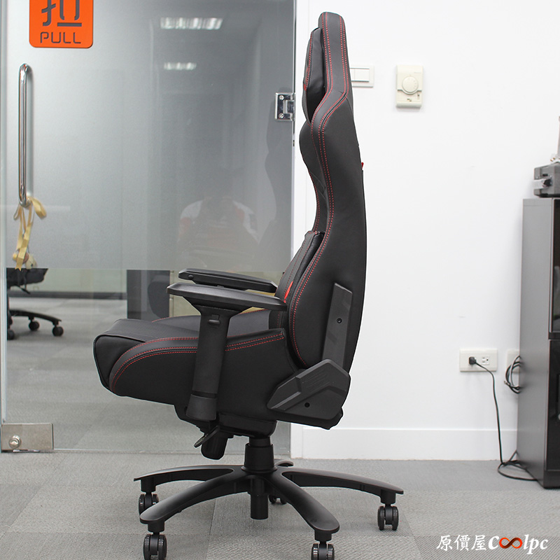 整張椅子與身體背面皮膚接觸的地方採用了大量的透氣PU皮革材質避免久坐悶熱造成的不適感,另外也可以看到座椅皮革的縫線都採用了紅色系設計增添電競氣息。