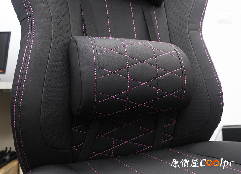 酷碼CALIBER E1屬於常見的賽車椅造型,設計非常的低調,沒有浮誇的花紋裝飾,僅用紫色車線簡單鋪陳,另外椅子有酷碼紫、粉色、暗影色三種配色,今天開箱的是神秘黑版本,看起來又更樸實無華。