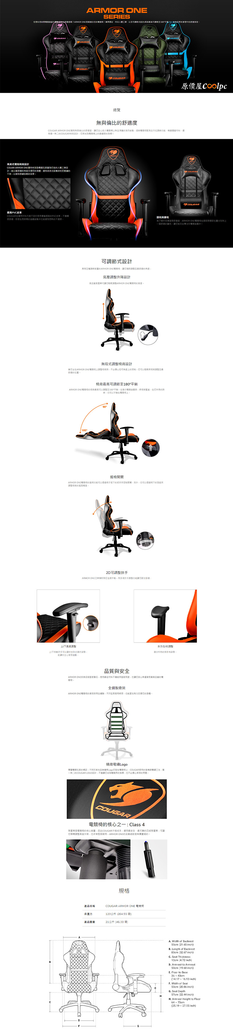 你的裝備不該只有PC強,坐的椅子當然也要強,COUGAR ARMOR ONE能夠支撐你的每一場持久戰!高背式結構完整支撐背部與頸部,獨立的頭枕與腰靠針對重點區域加強支撐,透氣PVC皮革面料搭配質感菱格紋設計,內部高密度泡棉與全鋼骨架製作,底部四級氣壓棒結合鋼製五星椅腳,耐重高達120KG。椅子可以無段式後仰調整,最高能夠180°平躺,還有搖椅和升降功能,扶手也是2D設計可以調整高度及斜方左/右。平時讓你坐著舒服,累了也能直接躺下,配合你的習慣做調整,有了COUGAR ARMOR ONE就是一種享受,現在可以用超划算的價格入手,真的別再猶豫了,趕緊趁著這次機會買起來吧。
